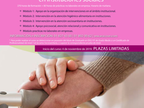 CERRADO EL PERIODO DE INSCRIPCIONES ¿Te gusta ayudar a los demás? ¿Quieres trabajar como cuidador profesional en una residencia de personas mayores o en centros de atención a la dependencia?. Desde ARACOVE, a través del programa LEADER, vamos a impartir de modo GRATUITO el certificado de profesionalidad SSCS0208 de atención sociosanitaria a personas dependientes en instituciones, con...