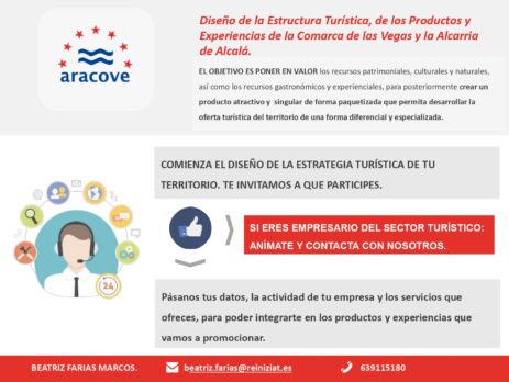 ATENCIÓN A LAS EMPRESAS DE LA COMARCA RELACIONADAS CON EL SECTOR TURÍSTICO Comienza el diseño de la Estrategia Turística de la Comarca de ARACOVE (Comarca de las Vegas y Alcarria de Alcalá), y para eso necesitamos contactar con las empresas de la zona relacionadas con el sector turístico. Si tienes una empresa que tenga que ver con...