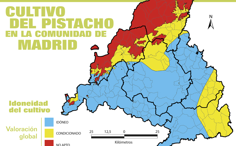 El pistachero es un cultivo rentable que constituye una oportunidad real para generar empleo y riqueza en regiones agrícolas del interior de España. Para que su desarrollo sea óptimo tienen que cumplirse unos requerimientos ambientales concretos que no se dan en todas las regiones del centro peninsular, pero si en la mayor parte de las zonas agrícolas de la Comunidad de Madrid. Sin embargo, la implantación de este cultivo en Madrid es muy inferior a lo que cabría esperar por su potencialidad. El objetivo general es promover el desarrollo de una estrategia de introducción del cultivo del pistacho en la Comunidad de Madrid, que se conseguirá a partir de los objetivos parciales (1) establecer pautas de manejo del cultivo que permitan un uso eficiente del suelo, del agua y de los fertilizantes, (2) validar el mapa de idoneidad climática en la Comunidad de Madrid, (3) realizar un ensayo de patrones, (4) fortalecer la cooperación entre los agentes del sector, (5) contribuir al incremento de la cualificación técnica y práctica del cultivo del pistacho, mediante un plan de formación que fomente el empleo regional.